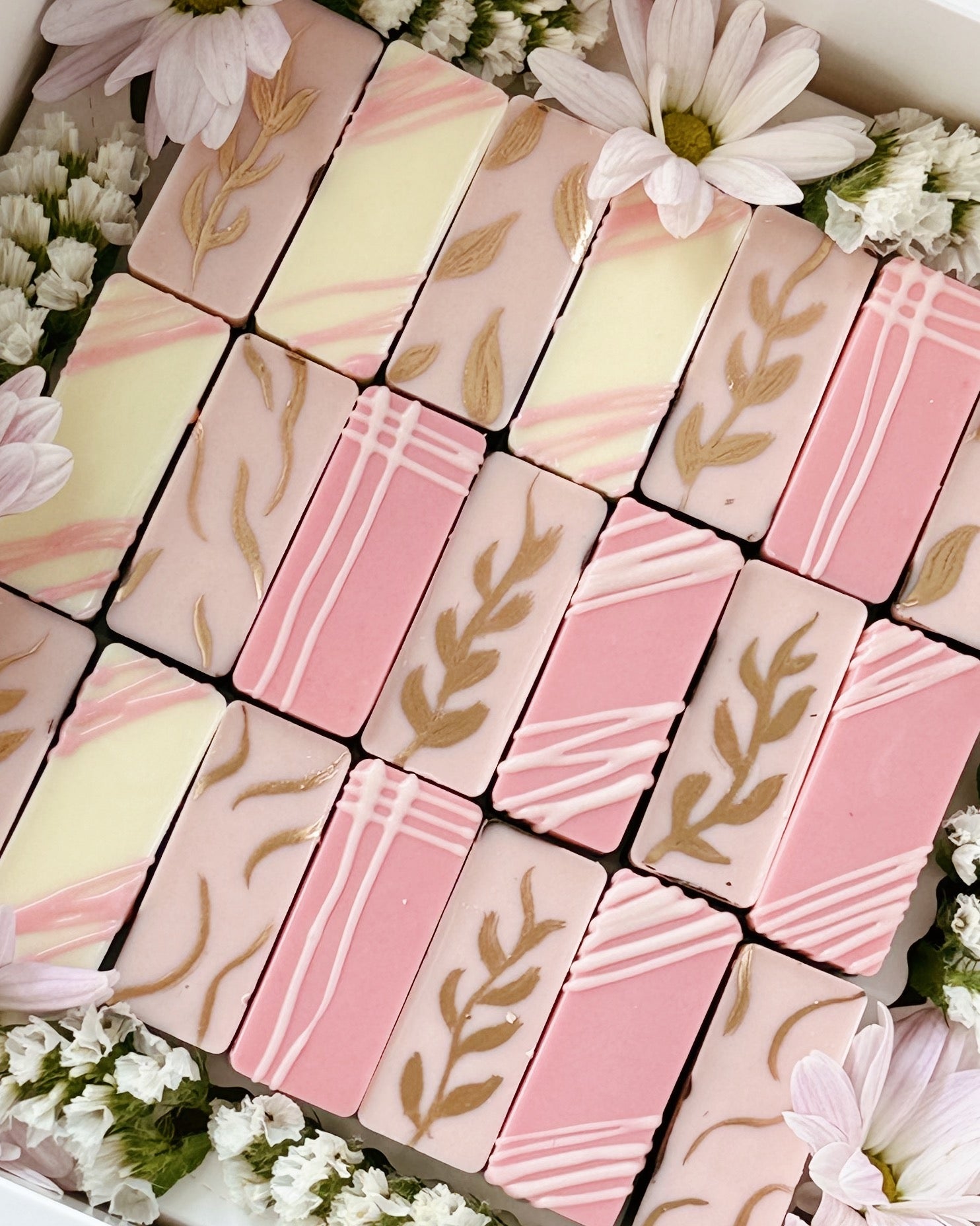 Flower types & colors in the box will be done randomly. Colors of chocolate will follow chosen color palette.